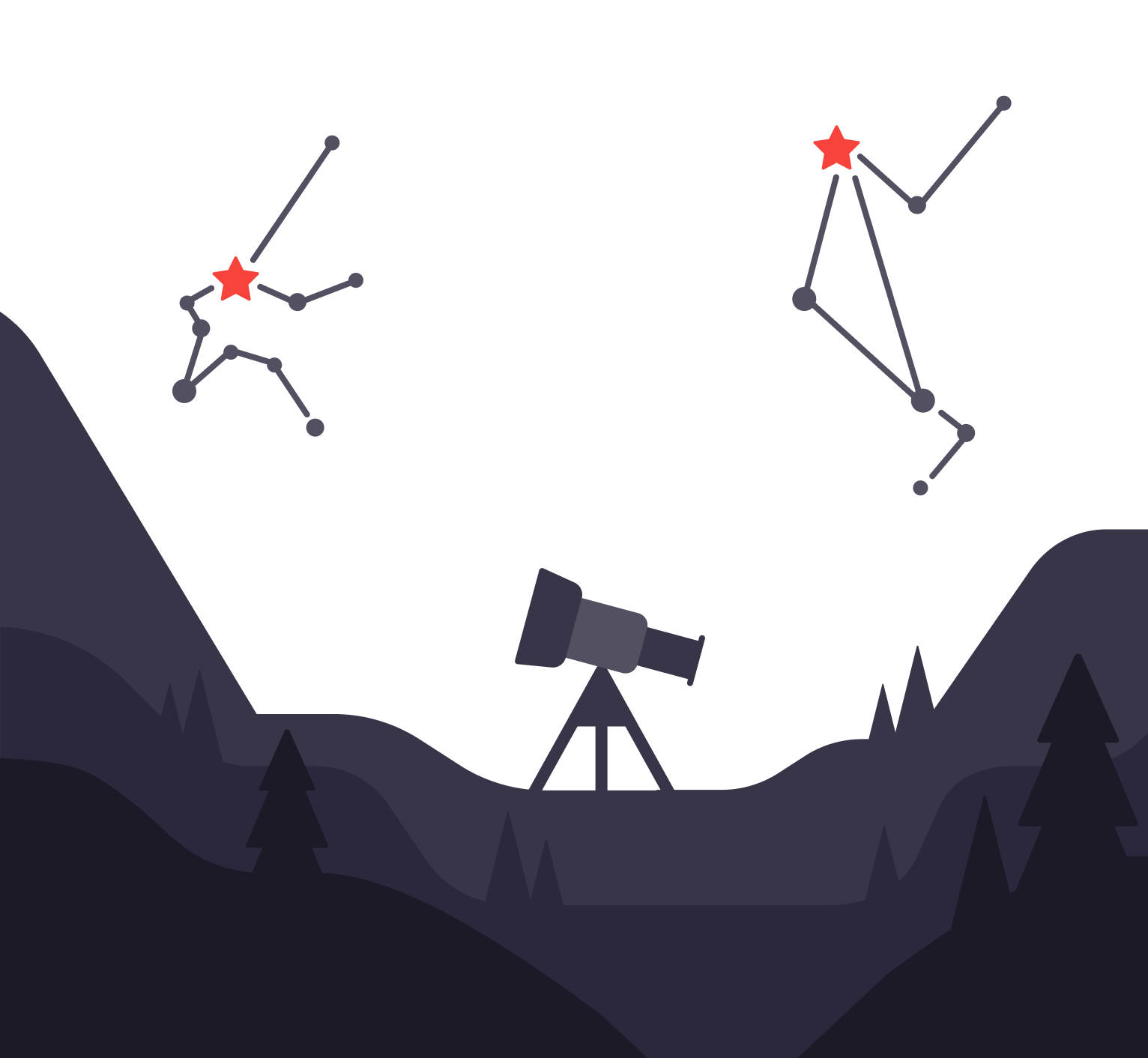 Landscape backgrounds and constellation icons, with food shapes as star clusters; unique foregrounds per module.